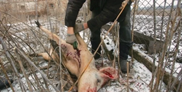 В начале 90-х поголовье украинских свиней равнялось 20 млн. Сейчас – в два с половиной раза меньше. В основном их выращивают небольшие частные фермы. Эти кадры сняты в деревушке на границе Сумской, Полтавской и Харьковской областей: свиноводством больше занимаются в центре страны, вблизи промышленных районов. Животное берут на убой, когда его вес достигает 110 кг, и обычно свиной век не длиннее полугода.