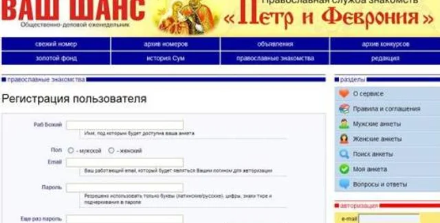 37-летний сумчанин Олег Харитонов говорит, то тоже зашел на этот сайт в надежде найти вторую половинку. По словам мужчины, опыт виртуальных знакомств у него уже был, но неудачный: "Я когда-то познакомился с девушкой через чат на одном из телеканалов. Отправил туда сообщение, мол, хочу познакомиться для серьезных отношений. Позвонила мне какая-то очень пьяная девица. Я надеюсь, в православную службу будут писать добропорядочные люди и обманывать не будут. Я бы хотел найти добрую, хорошую женщину, пусть у нее и будут какие-то недостатки"