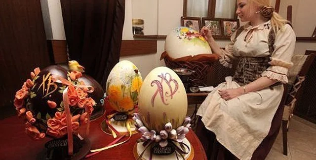 К великому празднику в Симферополе кондитеры изготовили два огромных яйца из белого шоколада и раскрасили их пищевыми красками. Вес каждого такого яйца 7,3 кг, а высота 80 см. Фотогалерю с события можно посмотреть в разделе Фото.