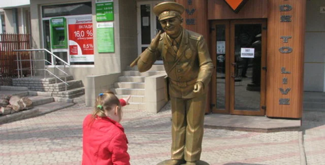 "У меня такая идея родилась случайно. Глядя, как сейчас в нашей стране борются с коррупцией и взяточничеством на дорогах, мы решили поставить памятник раскаявшемуся гаишнику. Нашли одного знакомого скульптора, который быстро воплотил идею в реальность. И теперь надеемся, что к нему будут привозить детей и молодых сотрудников ГАИ. Было бы здорово, чтобы рядом с ним будущие инспекторы дорожного движения давали клятву!" - говорит Александр Сирота, директор ресторана, возле которого установлен монумент.