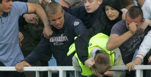 Как сообщает УНИАН, фанов возмутило присутствие в их секторах стюардов (в которых даже заподозрили переодетых милиционеров, о чем свидетельствуют ругательные возгласы в адрес стражей порядка, не позволявших переходить из сектора в сектор).