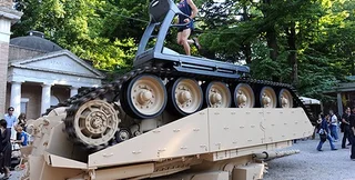 На лежащий гусеницами вверх танк взбирается атлетичного вида мужчина в спортивных трусах, нажимает на кнопку, гусеницы начинают с грохотом вращаться, а мужчина – бежать. К танку прилажена беговая дорожка, а все это вместе называется "Трасса и поле" и является частью экспозиции американского павильона. Публика здесь собиралась самая звездная – посмотреть на новое в актуальном искусстве приезжали Наоми Кэмпбелл, Леонардо ДиКаприо, Элтон Джон, Кортни Лав.