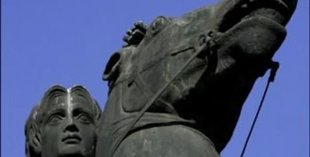 13-метровая бронзовая статуя изображает полководца сидящим верхом на лошади. Официально памятник называется "Воин на коне", но нет оснований сомневаться, что скульптор лепил именно Александра Македонского.