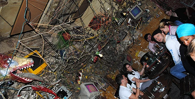 Когда пытаешься представить себе это заведение в дневном свете, становится жутковато, но ночью Szimpla Kert очаровывает деланной безалаберностью, потрепанными временем стенами, заклеенными пожелтевшими открытками и разрисованными граффити. Под потолками в темных закоулках висят сотни проводов, в которых путаются старые пузатые мониторы и транзисторы. На мониторах вспыхивают и танцуют под грохочущую музыку графические картинки.