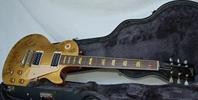 Золотая гитара Gibson модели Les Paul, корпус которой покрыт автографами известных исполнителей джаза и блюза, будет выставлен на благотворительный аукцион