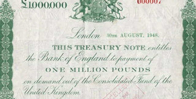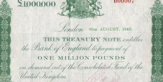 Купюры в миллион фунтов были выпущены в августе 1948 года в рамках "плана Маршалла" после Второй мировой войны и предназначались для расчетов между финансовыми институтами. По истечении шести недель, в течение которых банкноты сохраняли свою ценность, все они, за исключением двух, были уничтожены.