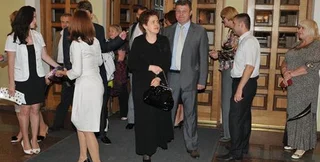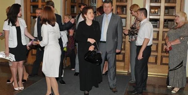 Появилась Людмила Янукович в театре за 15 минут до третьего звонка и все это время провела в фойе театра. Для выхода в свет жена главы государства выбрала строгий черный костюм и дополнила его классическими "лодочками" и небольшой лаковой сумочкой. Торжественности наряду добавили украшения – серьги и кольцо с жемчугом.