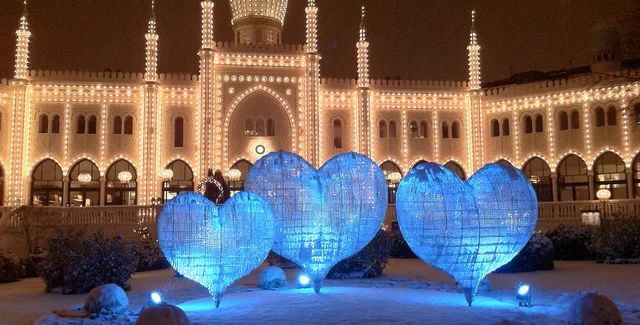 Куда бы вы ни направились, разгуливая по вечернему Копенгагену, вы непременно увидите 1800 светящихся нитей, натянутых над озером Тиволи, расположенным в одноименном парке развлечений. С 16 ноября старинный парк превращается в рождественскую сказку с множеством разноцветных гирлянд и ярких киосков, где можно купить всевозможные сладости, сувениры и изделия народных промыслов. Достопримечательность Тиволи – старинная двухэтажная карусель, которой уже 150 лет.