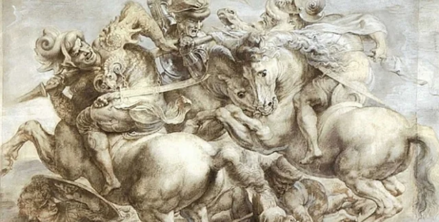 Как известно, фреска "Битва при Марчано" написана на стене Зала Пятисот в городской ратуше Флоренции XIV века Палаццо-Веккьо. В 1503 году Леонардо и Микеланджело получили заказ на роспись противоположных стен зала совета Палаццо-Веккьо. Обе фрески должны были повествовать о славных викториях флорентийцев. Микеланджело так и не продвинулся дальше эскиза, а Леонардо 6 июня 1505 года (в возрасте 53 лет) приступил к работе непосредственно у стены. Он должен был изобразить победу Флоренции над Миланом в 1440 году, сообщает compulenta.ru.