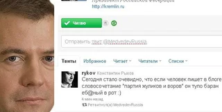 На странице президента России Дмитрия Медведева в Twitter была опубликована нецензурная запись кремлевского интернет-идеолога Константина Рыкова о противниках "Единой России"