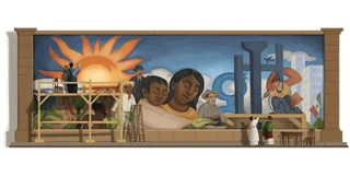 Художники Google отразили в праздничном логотипе характерные черты мурализма - монументальность, публицистический стиль изображения, ориентированность на социально-исторические проблемы, а также цветовые мотивы национальной живописи аборигенов Мексики.