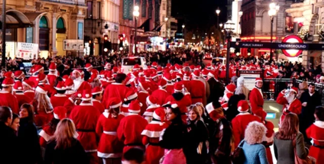 Каждый год в преддверии начала зимних праздников группа активистов проекта Santacon бросает клич в интернете, в социальных сетях, и организует однодневные гуляния в костюмах Санта Клаусов по Лондону. Как и в любом флешмобе, план действий, место и время встречи не разглашаются заранее, а появляются на сайте поздно ночью накануне мероприятия, сообщает РИА Новости.