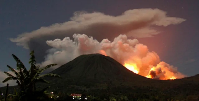 Облако пепла окутало две деревни с общим населением около 10 тысяч человек. В результате недавнего извержения вулкана Локон в июле этого года во временные убежища было эвакуировано более 5 тысяч человек.