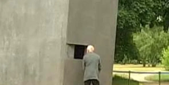 В бетонном монументе четырехметровой высоты проделано окошко, в котором воспроизводится видеозапись двух целующихся мужчин.