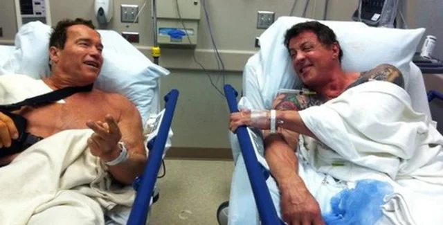 Звезды фильмов в стиле "экшн" Сильвестр Сталлоне и Арнольд Шварценеггер госпитализированы с травмами, полученными во время съемок. Об этом сообщил сам бывший губернатор штата Калифорния