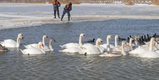 В этот раз лед на озерах ломали и сотрудники МЧС. С 29 января, когда холода в Крыму усилились, они дважды в день проводили спасательные операции на озере Сасык-Сиваш — вытаскивали изо льда птиц, прилетевших в Евпаторию на зимовку. Лебеди вместе с утками и чайками держались вместе — согревали друг друга. По ночам полынья в озере замерзала, птицы еще теснее прижимались друг к другу, и каждое утро к проруби вновь с ломами приезжали спасатели.