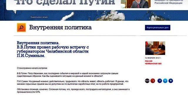 Тем не менее, 14 февраля этого года на сайте ЧтоСделалПутин.рф выложили информацию о разговоре Путина с Суминым, который якобы произошел именно в этот день. На сайте также была представлена стенограмма встречи, которая, правда, теперь уже удалена. Впрочем, следы прокола сохранились в кэше Google: Путин: "Петр Иванович, вас последние события в мировой и нашей экономике затронули существенным образом. Как вы оцениваете ситуацию на данный момент в области?". Сумин: "На данный момент, действительно, трудновато. Но область живет, область работает. Я думаю, что никаких серьезных срывов мы не допустим ни по выплатам заработных плат, ни с работой предприятий".