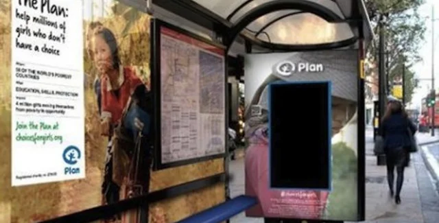 Дисплей стоимостью в £30,000 установлен общественной организацией Plan UK, которая оказывает помощь детям из стран третьего мира. Проходящие мимо женщины могут увидеть 40-секундный ролик, созданный в рамках кампании "Потому что я девочка", который призывает пожертвовать средства на получение образования для девочек из развивающихся стран.