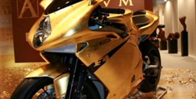 Компания MV Agusta на международной выставке роскоши International Fair of Luxury представила «bling-bling» мотоцикл с обтекателями и бензобаком, покрытыми настоящим золотом.