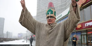 В Москве на Красной площади полиция задержала мужчину по фамилии Медведев, одетого в полотняную рубашку и с красной мигалкой на голове