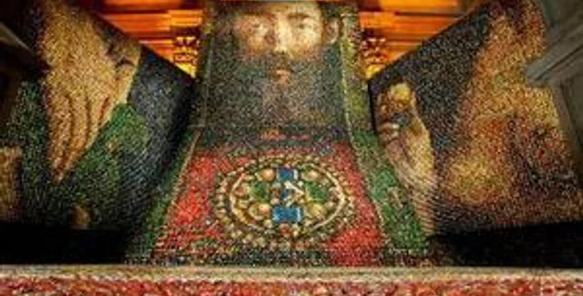 В Киеве на Софийской площади соорудили Алтарь наций - гигантскую композицию из 250 тысяч писанок, которая представляет собой копию Гентского алтаря работы фламандских художников 15 века братьев Ван Эйков, шедевра эпохи Возрождения.