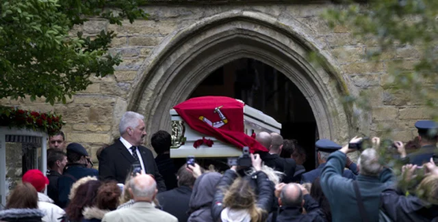 Церемония прощания с Гиббом прошла в небольшой церкви St Mary. Туда пригласили лишь близких друзей и родственников музыканта. Перед входом в здание на ветру трепетали две свечи, а внутри церковь, как и экипаж, была украшена белыми и розовыми цветами.