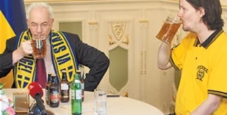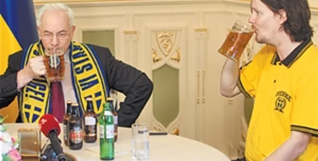 Премьер-министр Украины Николай Азаров выпил пива со шведским болельщиком Олом Сйостедтом, проспорившим ему пиво