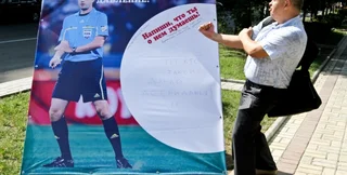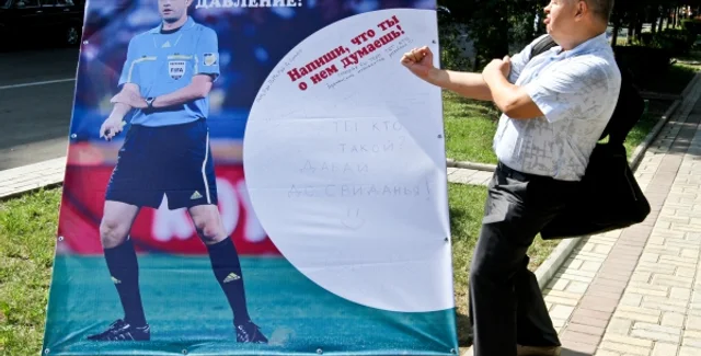 В Донецке появились плакаты с изображением венгерского судьи Виктора Кашшаи, не засчитавшего гол украинской сборной, под которыми каждый желающий может оставить свой отзыв о нем