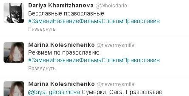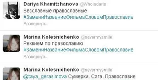 В связи с процессом над группой Pussy Riot в Twitter появился новый тренд по замене слов в названии популярных фильмов на слово "православие"