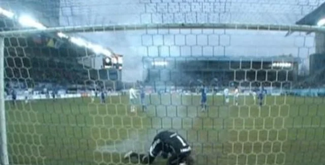 Взорвавшись, она оглушила стража ворот. После недолгих консультаций главный судья матча Алексей Николаев принял решение увести команды в раздевалку.