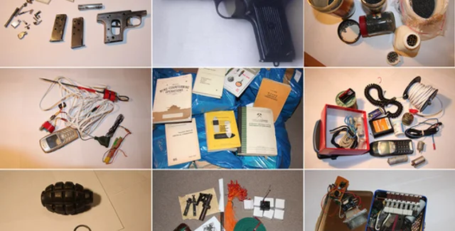 В квартире задержанного следователи изъяли тротил и другие взрывчатые вещества, детонаторы, сотовые телефоны, провода, пульты дистанционного управления, инструкции для изготовления бомб, оружие и свыше 1100 единиц боеприпасов, а также польские и иностранные автомобильные регистрационные номера, маски, пуленепробиваемый жилет, снайперскую маскировочную одежду.
