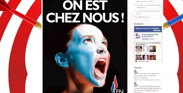 У главы молодежного движения Национального фронта Жюльена Рошди начались проблемы из-за того, что на плакате "Остановим антифранцузский расизм: мы у себя дома" изображена кричащая девушка, лицо которой раскрашено в красный, белый и синий цвет, как флаг Франции.