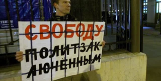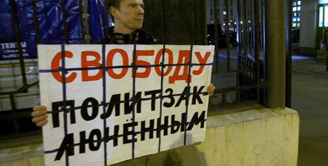 с белыми лентами, которые выкрикивали лозунг: "Свободу политзаключенным".