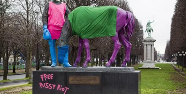 7 февраля неизвестные надели на головы бронзового воина и его коня балаклавы, набросили на их фигуры яркие тряпки и выкрасили монумент в розовый, фиолетовый и голубой цвета. На постаменте памятника была оставлена надпись "Free Pussy Riot".