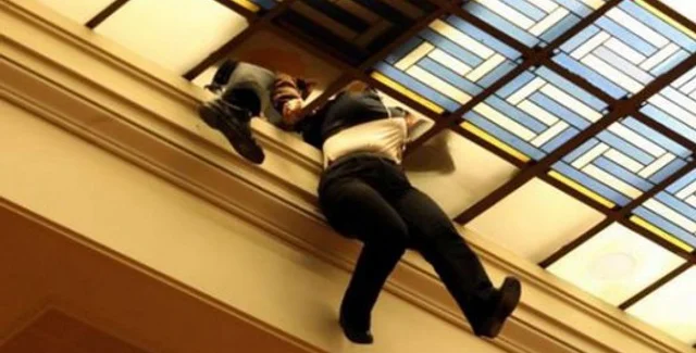 Женщине чудом удалось удержаться и не упасть. Отметим, высота потолка в зале заседаний превышает 10 метров.