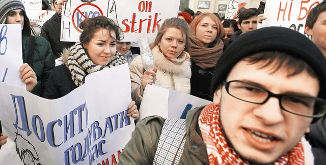 К комитетам Верховной Рады не протолкнуться — улица Банковая заполнена бойцами спецподразделения "Беркут" и студентами-активистами. Последние громко скандируют: "Мы за образование!" и поднимают транспаранты: "Требуем системных изменений" и "Нам учиться — нам и решать". На одном из плакатов — портрет Альберта Эйнштейна и подпись: "С 1187 даже у него не было бы шансов". Активисты уверены: если проект превратится в закон, в вузы вернется глобальная коррупция, бюджетные места будут ликвидированы, а власть над высшим образованием сосредоточится в министерстве. Двум альтернативным законопроектам студенты симпатизируют больше, так как те сохраняют академическую, кадровую и финансовую автономию вузов.