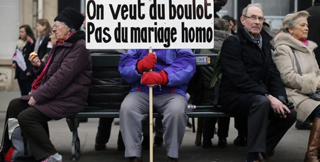 Законопроект вызвал ряд масштабных акций протеста во Франции. Консервативная оппозиция и церковь решительно возражали против однополых браков и усыновления геями детей.