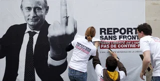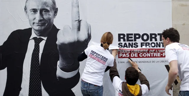 В Париже Репортеры без границ развесили плакаты с Путиным, показывающим средний палец