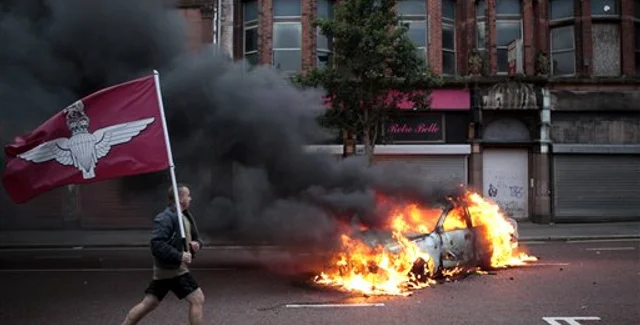 Столкновения в Белфасте начались, когда члены протестантской общины, сторонники сохранения Северной Ирландии в составе Соединенного Королевства, попытались преградить путь участникам парада - католикам, выступающим за объединение Ирландии.