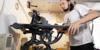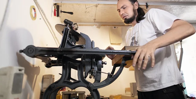 Типограф Федор Шульга выбирает из наборной кассы (металлического ящика со множеством ячеек) буквы: "Ф", "О", "К", "У", "С". И выкладывает их на специальную дощечку — верстатку. На вид она напоминает подставку под литеры в игре "Эрудит". Сложив слово, он помещает верстатку в железную рамку. Чтобы закрепить полученный текст, его обкладывают деревянными брусками. Затем рамку устанавливают в станок, а механизм с помощью рычага приводят в движение. Валики наносят краску на буквы. Чугунной плитой бумага прижимается к буквам. "Фокус удался!" — восклицает 35-летний типограф, показывая карточку с оттиском.