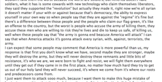 "Американские солдаты - трусы с современными технологиями, которые называют себя освободителями", - пишет автор. "Может быть они сильнее, может быть они уничтожат нашу армию, но они никогда не уничтожат небольшие очаги сопротивления. Это то, чем мы является. Мы были рождены, чтобы бороться и сопротивляться, мы будем бороться с ними везде, пока они не уйдут, откуда пришли, независимо от того, насколько сильно они будут стараться изгнать нас с нашей священной земли, им это никогда не удастся. Это то, откуда мы пришли, где наши корни и откуда родом наши предки", - говорится в тексте сообщения.