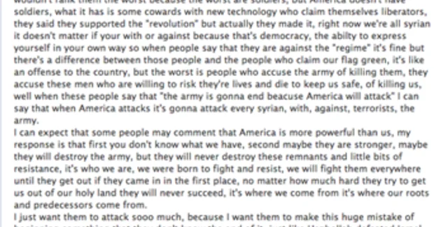 В пользу того, что сообщение действительно написал подросток из Сирии, говорят многочисленные орфографические и грамматические ошибки, которыми переполнен текст. Кроме того, некий сирийский журналист на условиях анонимности подтвердил, что аккаунты отпрысков политических деятелей, отметивших сообщение, являются подлинными.