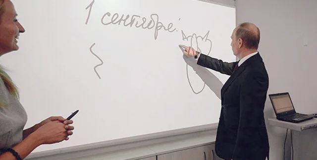 Молодая учительница, волнуясь, объяснила президенту России преимущества новой интерактивной доски, которая заменяет обычную школьную доску. Главная особенность — по ней можно писать специальным пером или же просто пальцем. Не дослушав объяснений преподавательницы, Путин стремительно подошел к доске и уверенно вывел пальцем абстрактный контур. Реализовав таким образом свой художественный порыв, глава РФ обратился к школьникам: "Это вам на память". И пока в наступившей тишине ученики и преподавательница пытались расшифровать президентское послание, послышался неуверенный детский голосок: "Что это?" "Это кошка. Вид сзади", — с улыбкой отчеканил Путин.