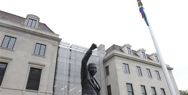 На официальной церемонии у посольства Южно-Африканской Республики в субботу 21 сентября присутствовали дочь Манделы Зиндзи и создатель трехметровой скульптуры - точной копии памятника, установленного в ЮАР возле тюрьмы в Кейптауне, где тот провел годы в заключении за попытки свергнуть режим апартеида.