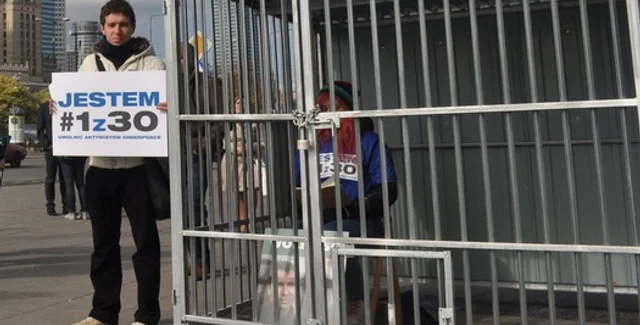 В центре Варшавы активисты установили металлическую клетку и и организовали рядом с ней посменные одиночные пикеты с надписью "Я один из тридцати заключенных активистов Greenpeace". Акция солидарности продлится четыре дня, до субботы, 5 октября, когда состоится Международный день акций в поддержку заключенных.
