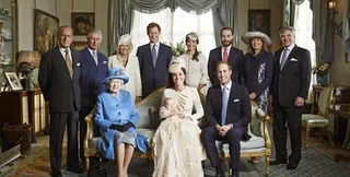 На другом снимке Кейт с ребенком сидят на диване, по правую руку от них - королева, по левую - принц Уильям. Супруг королевы герцог Филипп Эдинбургский, принц Чарльз, его супруга герцогиня Корнуоллская Камилла, младший брат Уильяма принц Гарри, младшие сестра и брат Кейт Пиппа и Джеймс Миддлтоны и родители герцогини Кейт Майкл и Кэрол Миддлтоны выстроились позади.