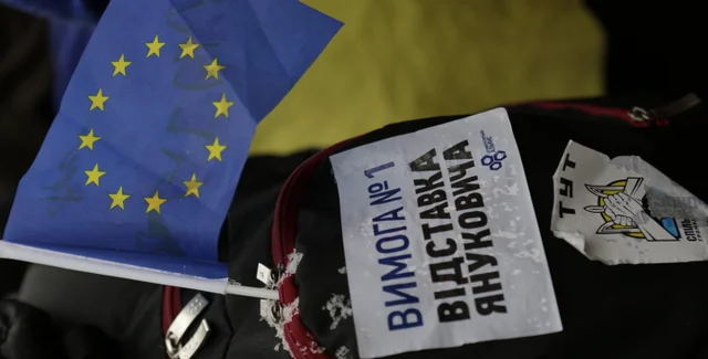 Участники акции держат различные флаги: государственные, Евросоюза, партийные (ВО "Батькивщина", УДАР, ВО "Свобода"), красно-черные. Кроме того, замечены несколько флагов Канады и Грузии. На некоторых государственных флагах участники акции написали названия населенных пунктов, которые они представляют.