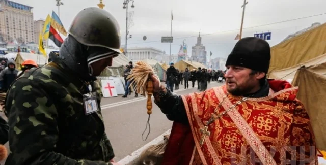 Между баррикадой и кордоном правоохранителей стоят священники, которые пришли сюда около 7.00, они не допускают обострения ситуации.