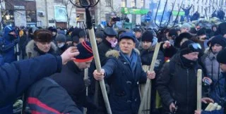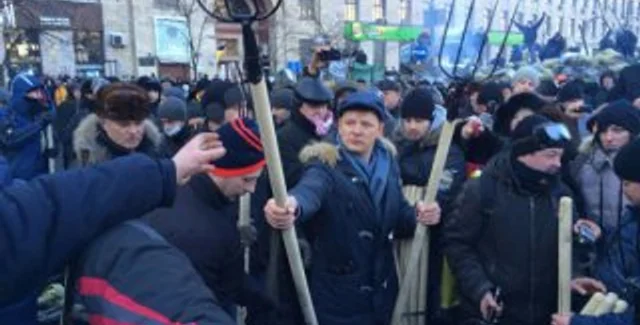 Внефракционный депутат Верховной Рады Олег Ляшко на баррикадах Евромайдана раздавал вилы