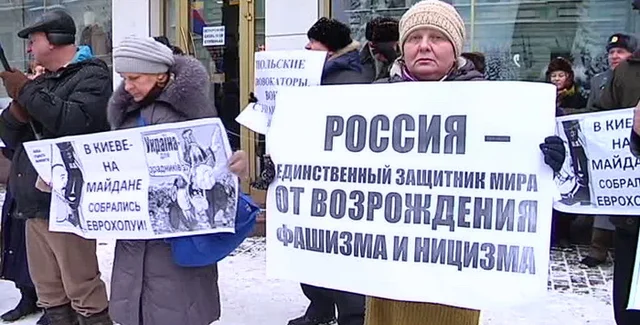 Члены общественного объединения юго-востока Русское вече развернули большой баннер: "Говори, смотри, слушай на русском".
